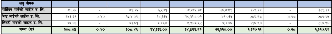 त्यस्तै, गार्डियन माइक्रो लाइफ इन्स्योेरेन्सले तीन करोड २९ लाख रुपैयाँ र लिवर्टी माइक्रो लाइफ इन्स्योरेन्सले दुई करोड १० लाख रुपैयाँ बराबरको कुल बीमा शुल्क आर्जन गर्न सफल भएका छन् ।