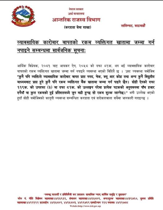 कुनै पनि व्यक्तिले व्यावसायिक कारोबार बापत प्राप्त नगद, चेक, क्युआर कोड अन्य कुनै विद्युतीय माध्यमबाट प्राप्त हुने कुनै पनि रकम व्यक्तिगत बैंक खातामा जम्मा गर्न नपाइने जनाएको छ ।