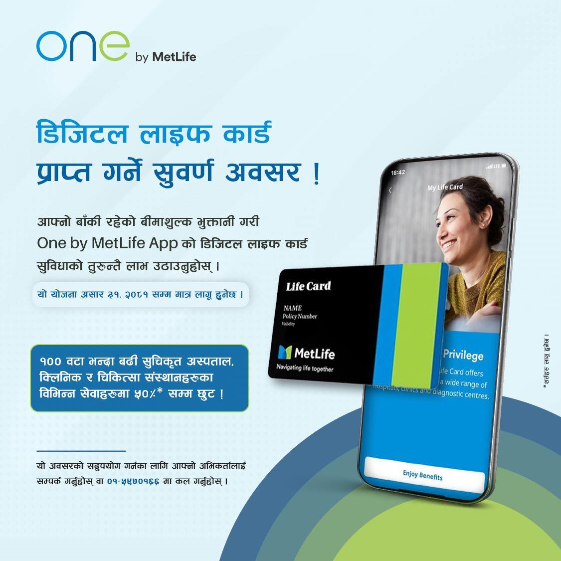 विशेष अफरको लागि योग्य हुन, मेटलाइफका ग्राहकहरूले आफ्नो कुनै पनि जीवन बीमा पोलीसीको असार ३१, २०८१ अघि आफ्नो बीमाशुल्क तिर्नु पर्नेछ । उनीहरूले वान बाई मेटलाइफ एपमा दर्ता र लग इन गरेर भुक्तानी गरेको भोलिपल्टै आफ्नो डिजिटल लाइफ कार्ड प्राप्त गर्न सक्नेछन् । यो सुविधाद्वारा ग्राहकहरूले तुरुन्तै आफ्नो स्वास्थ्य आवश्यकताहरूलाई पूर्ति गर्न विभिन्न छुटहरुको फाइदा लिन सक्नेछन्।