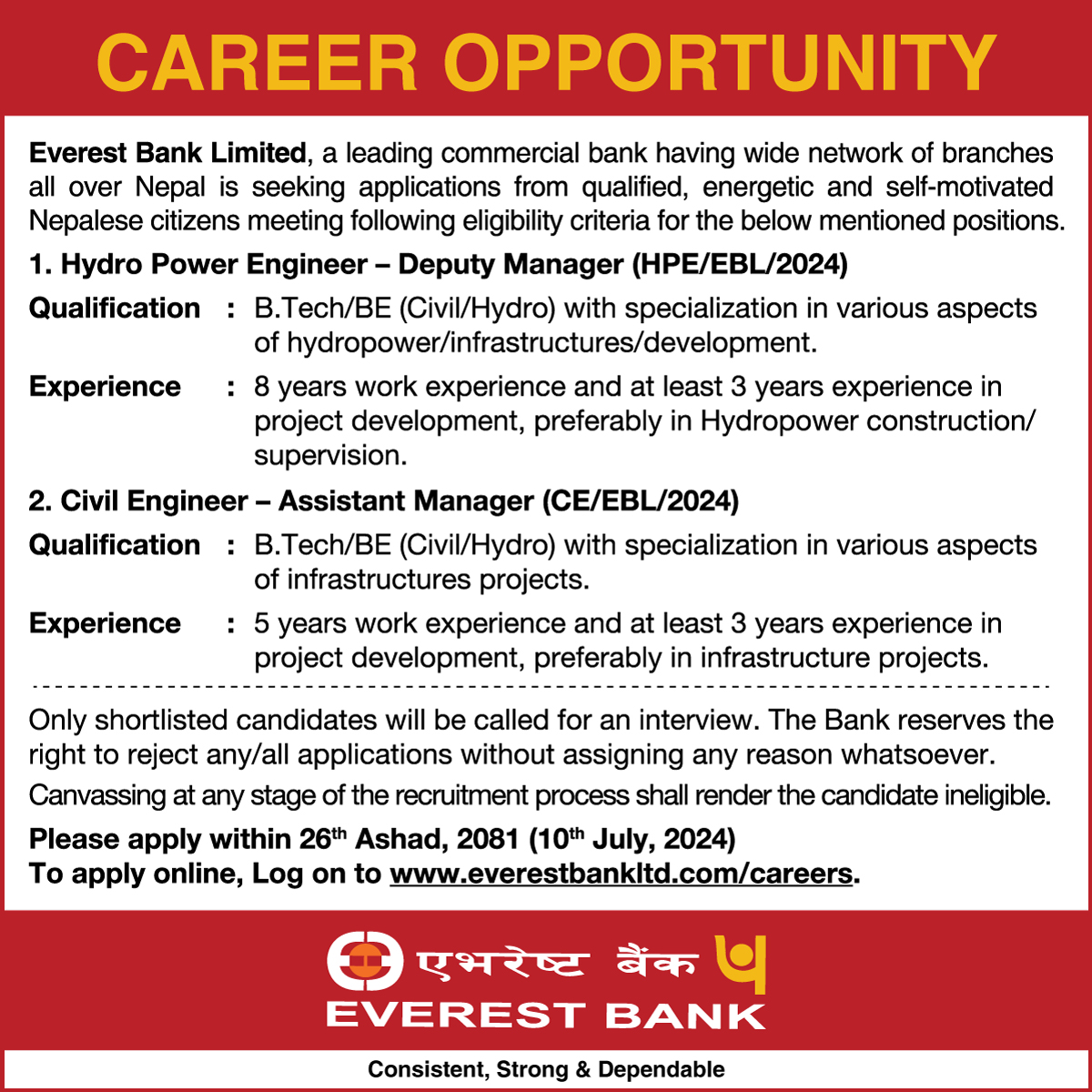 योग्यता पुगेका इच्छुक ब्यक्तिले आवश्यक कागजात संकलन गरी असार २६ गतेसम्म कम्पनीको बेवसाइट https://everestbankltd.com/careers/ मार्फत आवेदन दिन सकिनेछ ।