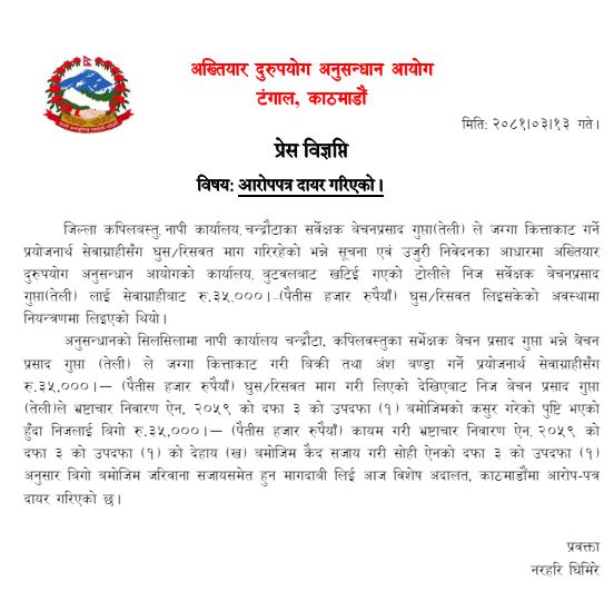 काठमाडौँ । कपिलवस्तु, नापी कार्यालय, चन्द्रौटाका सर्वेक्षक बेचनप्रसाद गुप्ता विरुद्ध भ्रष्टाचार मुद्दा दायर भएको छ ।