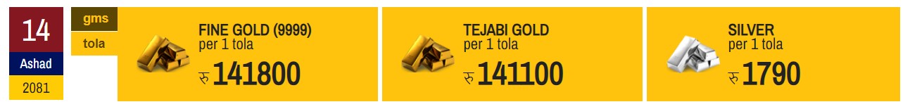 नेपाल सुनचाँदी ब्यवसाय महासंघका अनुसार आज छापावाला सुनको मूल्य प्रतितोला एक लाख ४१ हजार ८०० रुपैयाँ र तेजावी सुन प्रतितोला एक लाख ४१ हजार १०० रुपैयाँमा कारोबार भइरहेको छ ।