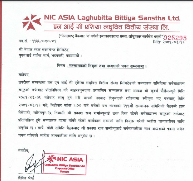 काठमाडौं । एनआईसी एशिया लघुवित्त वित्तीय संस्था लिमिटेडको अध्यक्षमा सञ्चालक प्रकाश राज शर्मा चयन भएका छन् ।