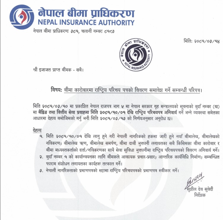 प्राधिकरणले नयाँ बीमालेख, बीमालेखको नवीकरण, बीमालेख ऋण, बीमालेख समर्पण, बीमा दाबी भुक्तानीलगायत सबै किसिमका बीमा कारोबारमा राष्ट्रिय परिचयपत्र अनिवार्य गर्न पनि निर्देशन दिएको हो ।