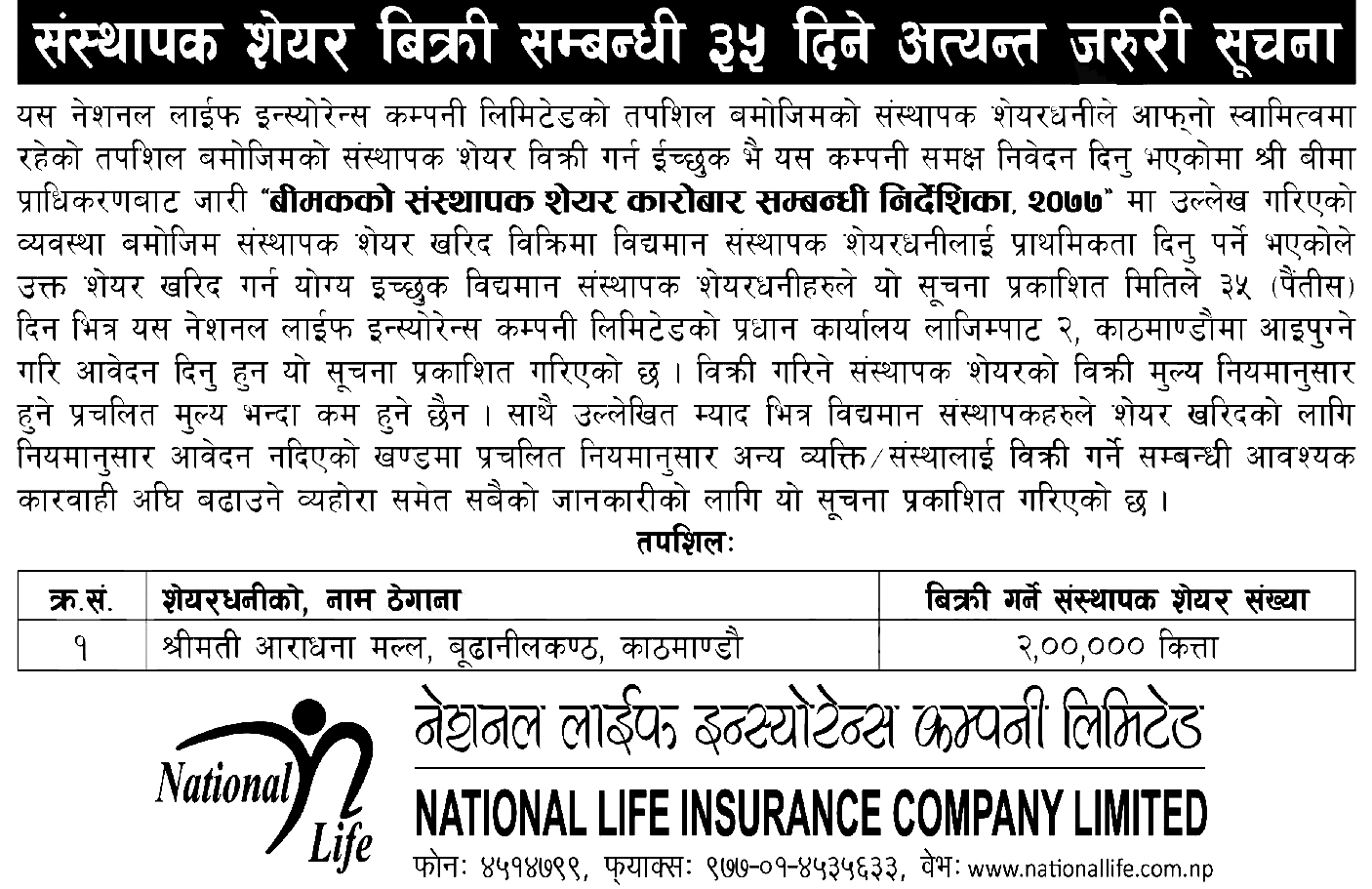 काठमाडौं । नेशनल लाइफ इन्स्योरेन्स कम्पनी लिमिटेडले शेयरधनी आराधना मल्लको नाममा रहेको दुई लाख कित्ता संस्थापक शेयर बिक्रीमा ल्याएको छ । कम्पनीले हाल विद्यमान संस्थापक शेयरधनीहरूले मात्रै किन्न पाउने गरी सो शेयर बिक्रीमा ल्याएको हो ।