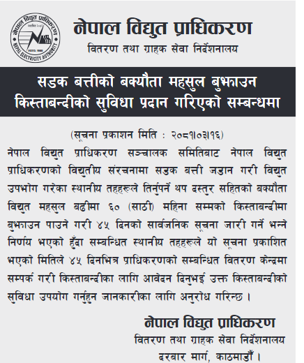 प्राधिकरणले सडक बत्ती जडान गरी विद्युत् उपभोग गरेका स्थानीय तहहरूले तिर्नुपर्ने थप दस्तुर सहितको बक्यौता विद्युत् महसुल बढीमा ६० महिना सम्मको किस्ताबन्दीमा बुझाउन पाउने व्यवस्था गरेको बताएको छ ।