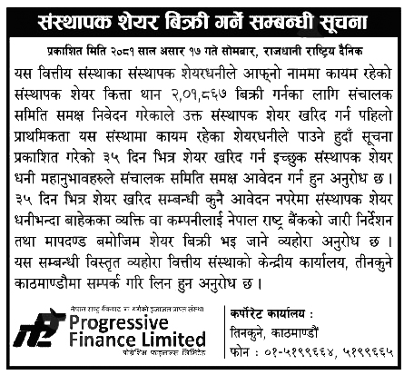 काठमाडौं । प्रोग्रेशिभ फाइनान्स लिमिटेडले आफ्नो संस्थापक शेयरधनीको नाममा रहेको दुई लाख एक हजार ८६७ कित्ता संस्थापक शेयर बिक्रीमा ल्याएको छ । उक्त शेयर खरीदका लागि हाल कम्पनीका विद्यमान संस्थापक शेयरधनीहरूले मात्रै आवेदन दिन सक्नेछन् ।