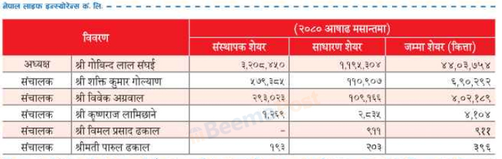 नेपाल लाइफ इन्स्योरेन्समा सञ्चालक समिति अध्यक्ष गोबिन्द लाल संघईको नाममा ४४ लाख ३ हजार कित्ता बराबरको शेयर स्वामित्व रहेको छ । उनीसँग संस्थापक समुहको ३२ लाख ८ हजार र साधारण समुहको ११ लाख ९५ लाख कित्ता बराबरको शेयर स्वामित्व रहेको छ ।
