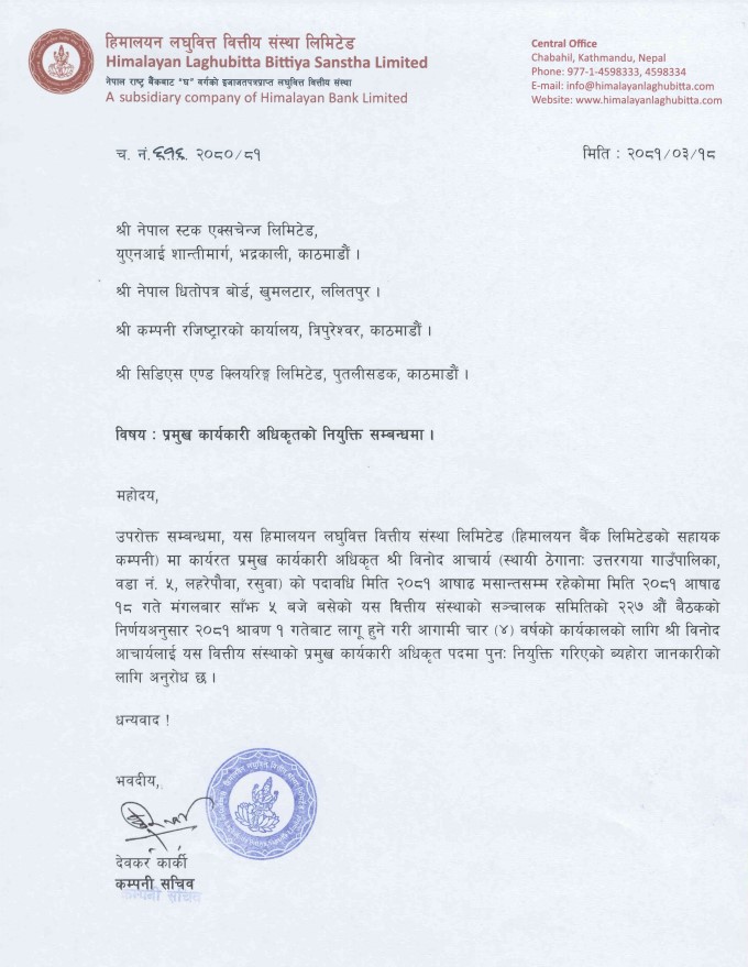 काठमाडौं । हिमालयन लघुवित्त वित्तीय संस्था लिमिटेडको प्रमुख कार्यकारी अधिकृत (सिईओ)मा विनोद आचार्य पुनः नियुक्त भएका छन् ।
