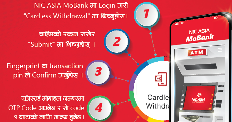 बैंकले ‘एनआईसी एशिया मो बैंक’ एप प्रयोग गरी एटिएमबाट कार्डबिनै नगद रकम झिक्न सकिने सुविधा करिव २ वर्ष अगाडिदेखि नै सञ्चालनमा ल्याएको थियो । बैंकमा खाता खोली मोबाइल बैंकिङ सेवा लिएका ग्राहकले देशभर रहेका ६७० वटा एटीएमबाट यो सेवा प्रयोग गरी आफुलाई आवश्यक परेको समयमा नगद निकाल्दै प्रयोग गरिरहेका छन् ।