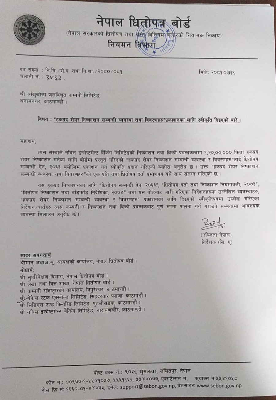काठमाडौं । आँखुखोला जलविद्युत कम्पनी लिमिटेडले हकप्रद शेयर निष्काशनका लागि नेपाल धितोपत्र बोर्डबाट अनुमति पाएको छ ।