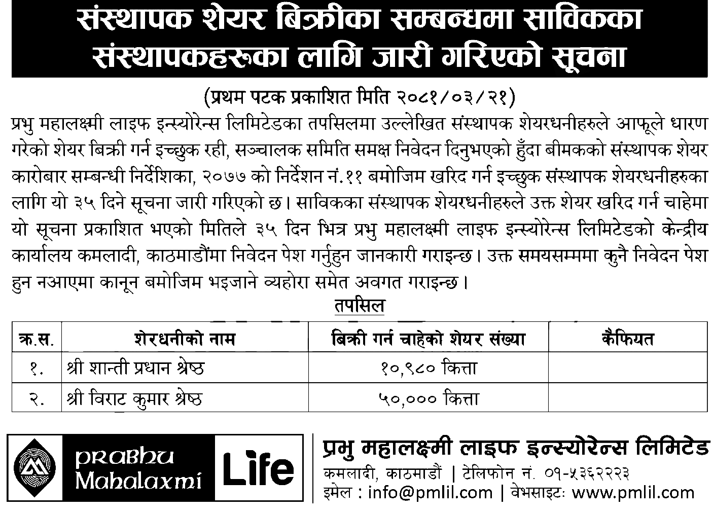 काठमाडौं । प्रभु महालक्ष्मी लाइपm इन्स्योरेन्स लिमिटेडले दुईजना संस्थापक शेयरधनीहरूको नाममा रहेको ६० हजार ९८० कित्ता संस्थापक शेयर बिक्रीमा ल्याएको छ । कम्पनीले हाल संस्थापक शेयरधनीले मात्रै खरीद गर्न पाउने गरी यो शेयर बिक्रीमा ल्याएको हो ।