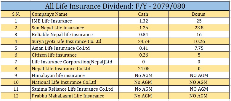 सन नेपाल लाइफले २३.८० प्रतिशत बोनश र १.२५ प्रतिशत नगद लाभांश वितरण गरेको छ । सबैभन्दा बढी चुक्ता पुँजी भएको नेपाल लाइफले २१ प्रतिशत नगद लाभांश वितरण गर्न वार्षिक साधारण सभाबाट पनि पारित गरिसकेको छ । साथै, रिलायबल नेपाल लाइफले १६ प्रतिशत बोनश शेयर ०.८४ प्रतिशत नगद लाभांश वितरण गरेको छ ।