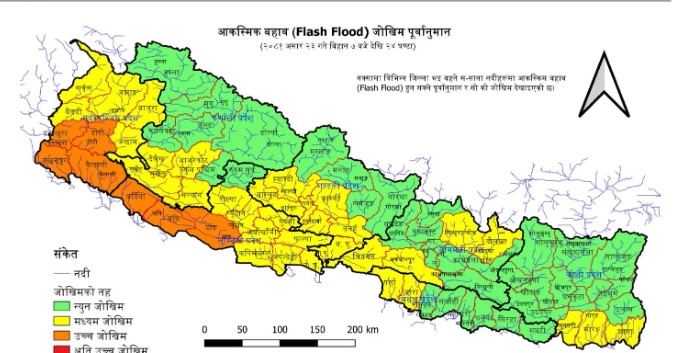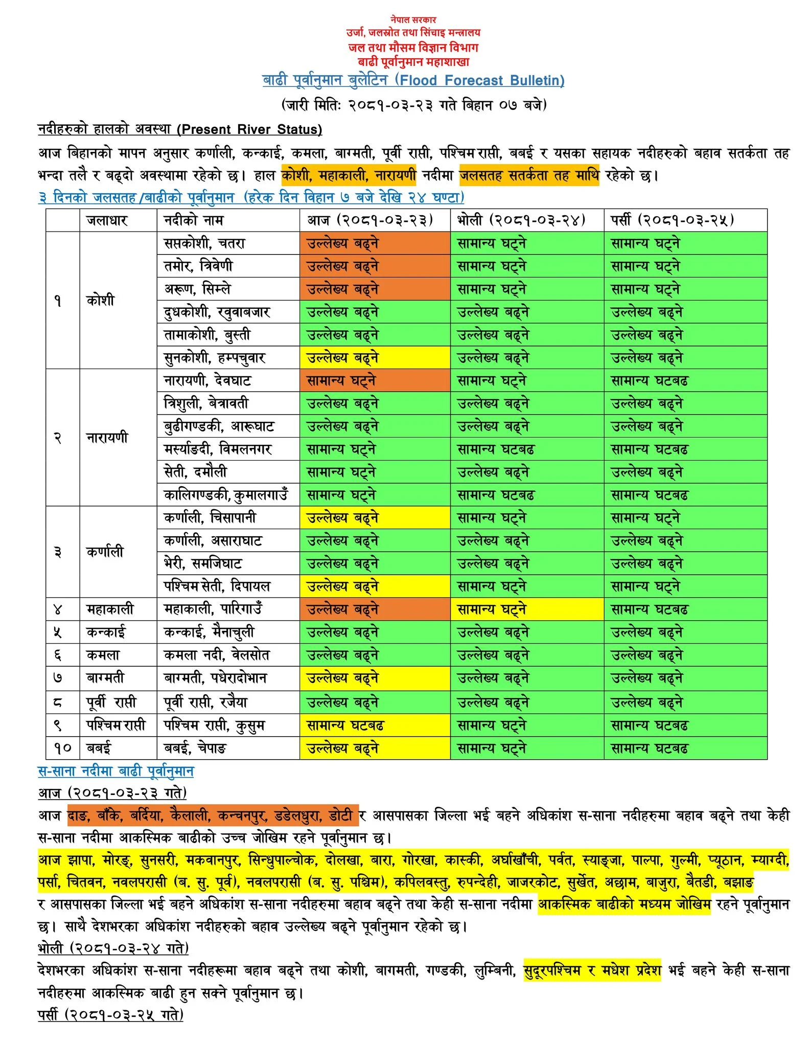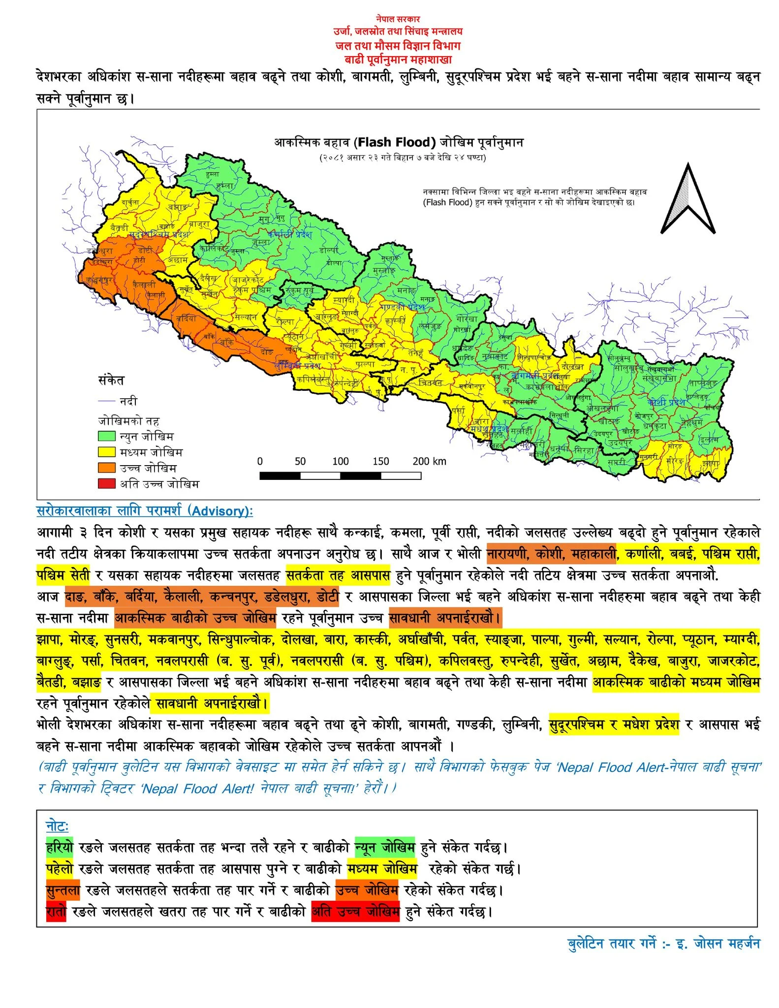 बाढी पूर्वानुमान महाशाखाले आज दाङ, बाँके, बर्दिया, कैलाली, कञ्चनपुर, डडेलधुरा, डोटी र आसपासका जिल्ला भई बहने अधिकांश स–साना नदीहरूमा बहाव बढ्ने तथा केही नदीमा आकस्मिक बाढीको जोखिम रहेको बताएको छ ।