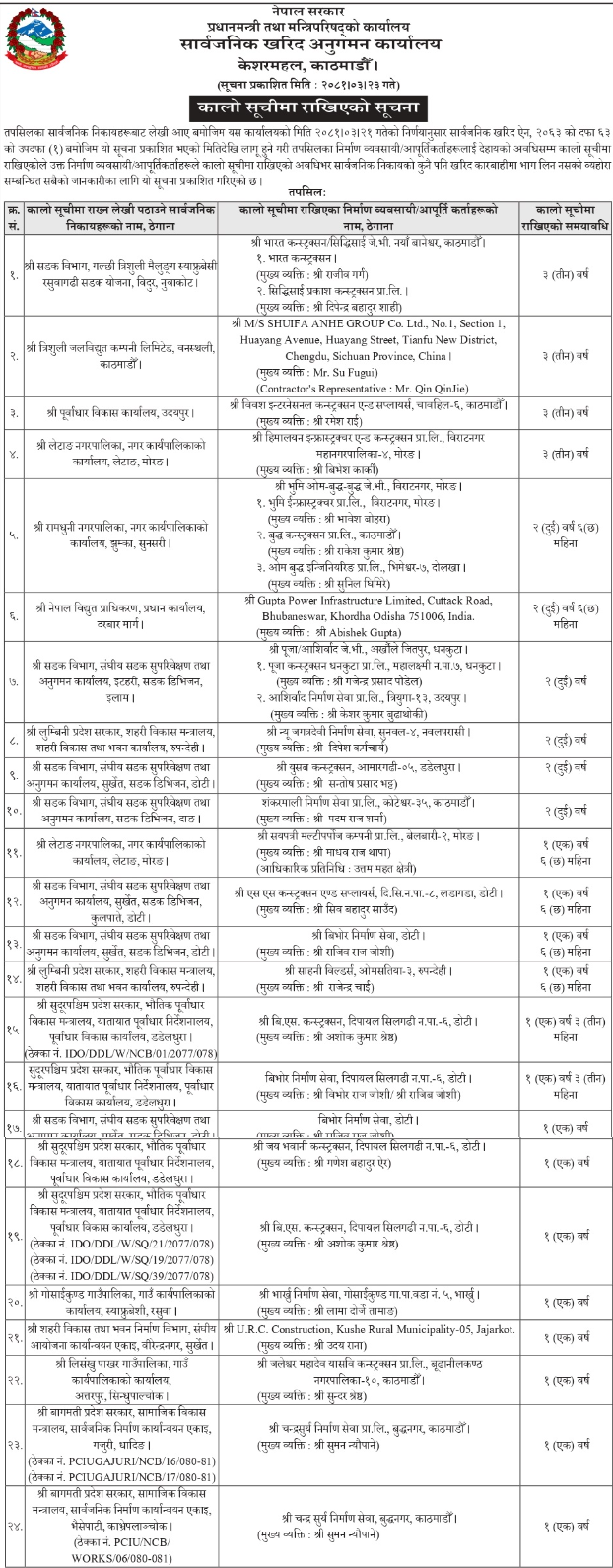 कार्यालयले सार्वजनिक खरिद ऐन, २०६३ को दफा ६३ को उपदफा (१) बमोजिम निर्माण कम्पनीलाई कालोसूचीमा राखेको जनाएको छ । जसमा ५ वटा निर्माण कम्पनीलाई ३ वर्ष, ४ निर्माण कम्पनीलाई साढे २ वर्ष, ५ निर्माण कम्पनीलाई २ वर्ष, ४ निार्मण कम्पनीलाई डेढ वर्ष, २ निर्माण कम्पनीलाई १३ महिना र अन्य ८ निर्माण कम्पनीलाई १ वर्षसम्मका लागि कालो सूचीमा राखिएको छ ।