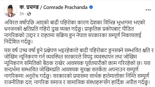 विपद्का बेला हातेमालो गर्न विभिन्न राजनीतिक दल, नागरिक समाज र सामाजिक संस्थालाई पनि प्रचण्डले आग्रह गरेका छन् । प्रचण्डले बाढी पहिरोका कारण देशका विभिन्न भूभागमा भएको धनजनको क्षतिप्रति दुख व्यक्त गरेका छन् ।