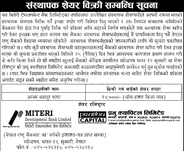 उक्त शेयर खरीद गर्न इच्छुक संस्थापक शेयरधनीले आवश्यक कागजात सहित असार २४ गतेले ३५ दिनभित्र खरीद गर्न चाहेको शेयर विवरण पनि खुलाई बैंकको केन्द्रीय कार्यालय वा शेयर रजिष्ट्रार प्रभु क्यापिटल लिमिटेडमा निवेदन दिनु पर्नेछ ।