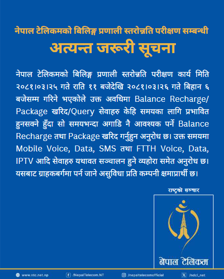 बिलिङ प्रणाली स्तरोन्नति परीक्षणका क्रममा ब्यालेन्स रिचार्ज, प्याकेज खरिद वा सोधपुछ सेवा केही समयका लागि प्रभावित हुनसक्ने टेलिकमले जानकारी दिएको छ ।
