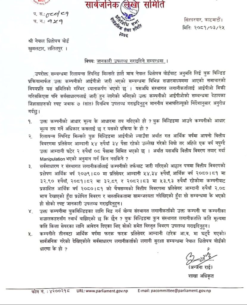 काठमाडौँ । संघीय संसदको सार्वजनिक लेखा समितिले एक साताको समय दिएर नेपाल धितोपत्र बोर्डसँग रिलायन्स मिल्सको आइपीओ सम्बन्धमा प्रष्टिकरण माग गरेको छ । आम सर्वसाधारणलाई वित्तीय विवरण झुक्याएर महङ्गो मूल्यमा बुक बिल्डिङ्गबाट आइपीओ निष्कासन गर्न लागेको उक्त कम्पनीको आइपीओ अनुमतिदेखिका विषय समेटेर लेखा समितिले बोर्डसँग जवाफ माग गरेको हो ।