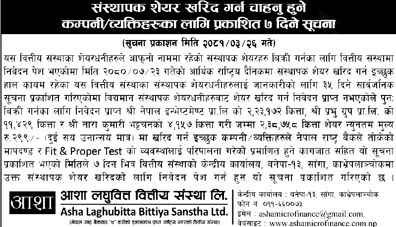 काठमाडौं । आशा लघुवित्त वित्तीय संस्था लिमिटेडले संस्थापक शेयरधनीहरूको नाममा रहेको दुई लाख ३८ हजार ७५८ कित्ता संस्थापक शेयर बिक्रीमा राखेको छ । कम्पनीले प्रतिकित्ता न्यूनतम २९९ रुपैयाँमै सो संस्थापक शेयर बिक्रीमा राखेको हो ।