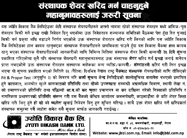 काठमाडौं । ज्योति विकास बैंंक लिमिटेडले आफ्ना शेयरधनीहरूको नाममा रहेको संस्थापक शेयर सर्वसाधारणमा बिक्री खुला गरेको छ ।
