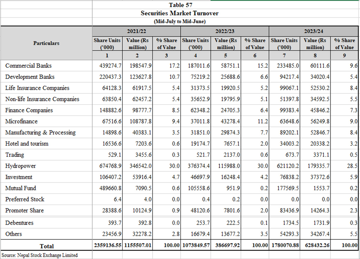 चालु आर्थिक वर्षको जेठ मसान्तसम्ममा निर्माण र प्रशोधन समूहको ८.४ प्रतिशत हिस्सा अर्थात ५२ अर्ब ८४ करोड ६७ लाख रुपैयाँ, जीवन बीमा समूहको ८.४ प्रतिशत हिस्सा अर्थात् ५२ अर्ब ५३ करोड रुपैयाँ, फाइनान्स समूहको ७.३ प्रतिशत हिस्सा अर्थात् ४५ अर्ब ८४ करोड रुपैयाँ, निर्जीवन बीमा समूहको ५.५ प्रतिशत हिस्सा अर्थात् ३४ अर्ब ५९ करोड रुपैयाँ र विकास बैंक समूहको ५.४ प्रतिशत हिस्सा अर्थात् ३४ अर्ब ३ करोड रुपैयाँको शेयर कारोबार भएको छ ।