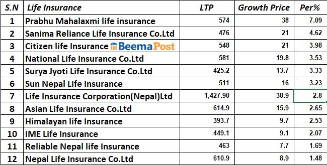 यसदिन सर्वोधिक शेयर मूल्य बढाउने कम्पनीमा प्रभु महालक्ष्मी लाइफ रहेको छ । कम्पनीको शेयर ७.०९ प्रतिशतले बढेर ५७४ रुपैयाँमा कायम भएको हो । साथै, सानिमा रिलायन्स लाइफको ४.६२ प्रतिशतले बढेर ४७६ रुपैयाँ, सिटिजन लाइफको ३.९८ प्रतिशतले बढेर ५४८ रुपैयाँ, नेशनल लाइफको ३.५३ प्रतिशतले बढेर ५८१ रुपैयाँ र सूर्यज्योति लाइफको ३.३३ प्रतिशतले बढेर ४२५ रुपैयाँ पुगेको छ ।