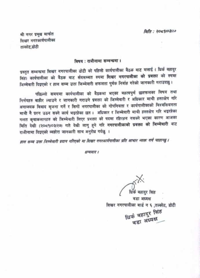 काठमाडौँ । डोटी जिल्लाको शिखर नगरपालिकाका प्रवक्ता तथा वडा न. ६ का वडा अध्यक्ष धिर्क बहादुर सिहंले आफ्ना अधिकार र जिम्मेवारी माथि हस्तक्षेप भएको भन्दै प्रवक्ता पदबाट राजीनामा दिएका छन् । उनले आज शिखर नगरपालिकाका प्रमुखलाई आफ्ना राजीनामा पेश गरेको हुन् ।
