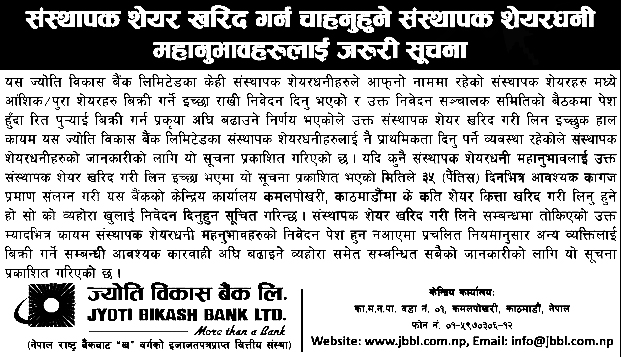 ज्योति विकास बैंकको संस्थापक शेयर बिक्रीमा