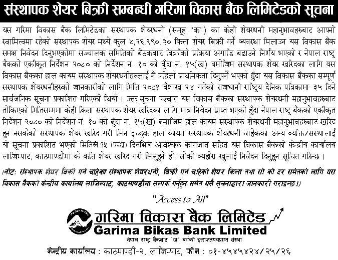 काठमाडौं । गरिमा विकास बैंक लिमिटेडले संस्थापक शेयर बिक्रीमा राखेको छ । बैंकले केही संस्थापक शेयरधनीहरूको नाममा रहेको ४ लाख २६ हजार ९९०.३० कित्ता संस्थापक शेयर बिक्रीमा राखेको हो ।