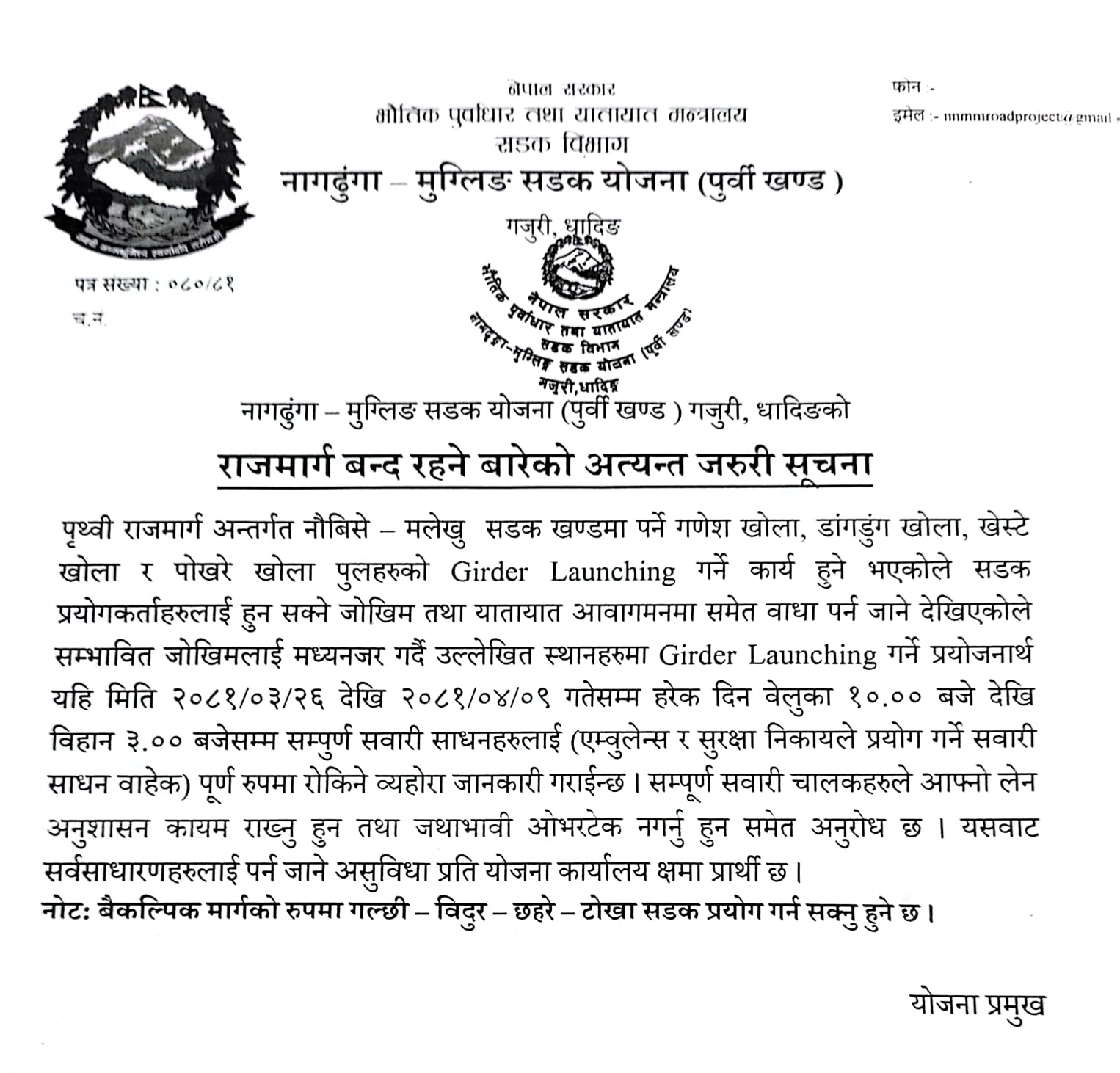 सडक प्रयोगकर्तालाई हुनसक्ने जोखिम तथा यातायात आवागमनमा बाधा पर्न जाने देखिएकाले सम्भावित जोखिमलाई दृष्टिगत गरी उक्त सडक बन्द गर्ने निर्णय भएको विभागले जनाएको छ ।