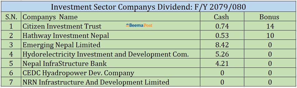 त्यस्तै, इमर्जिङ नेपाल लिमिटेडले ८.४२ प्रतिशत लाभांश वितरण गरेको छ । हाइड्रोइलेक्ट्रीसिटी इन्भेष्टमेन्ट एण्ड डेभलपमेन्ट कम्पनीले ५.२६ प्रतिशत नगद, नेपाल इन्फ्रास्टक्चले ४.२१ प्रतिशत नगद, हाथवे इन्भेष्टमेन्टले १० प्रतिशत बोनश शेयर र ०.५३ प्रतिशत नगद लाभांश वितरण गरेको छ ।