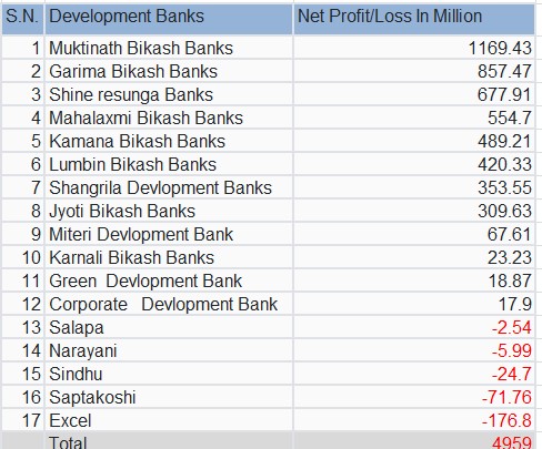 विकास बैंकहरुको ११ महिनाको तथ्यांकले यस्तो देखाएको हो । यस अवधिसम्ममा मुक्तिनाथ विकास बैंकले सबैभन्दा धेरै मुनाफा आर्जन गर्न सफल भएको छ।