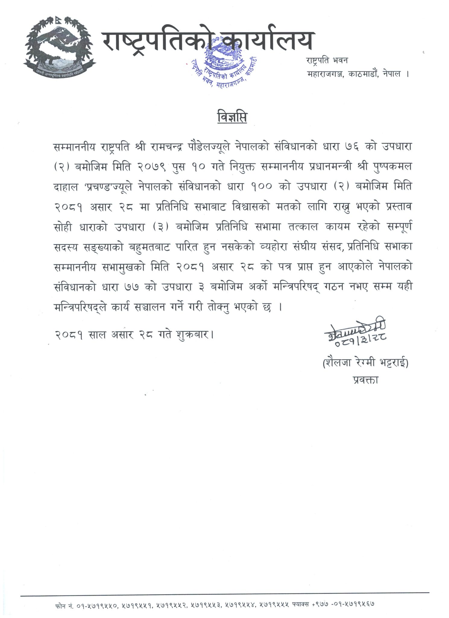 विश्वासको मत नपाएका प्रचण्डलाई राष्ट्रपति रामचन्द्र पौडेलले संविधानको धारा ७७ को उपधारा ३ बमोजिम अर्को मन्त्रिपरिषद् गठन नभएसम्मका लागि प्रधानमन्त्रीको जिम्मेवारी दिएका हुन् ।