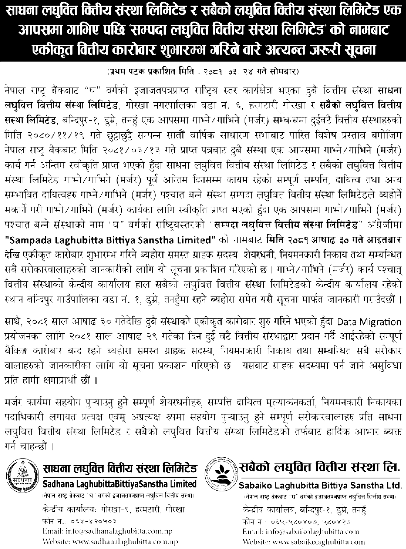 काठमाडौं । सबैको लघुवित्त वित्तीय संस्था लिमिटेड र साधना लघुवित्त वित्तीय संस्था लिमिटेड आपसमा मर्ज भई बनेको ‘सम्पदा लघुवित्त वित्तीय संस्था लिमिटेड’ले आज असार ३० गते आइतबारदेखि एकीकृत कारोबार शुरू गर्दैछ ।
