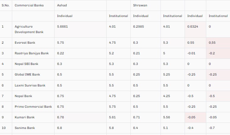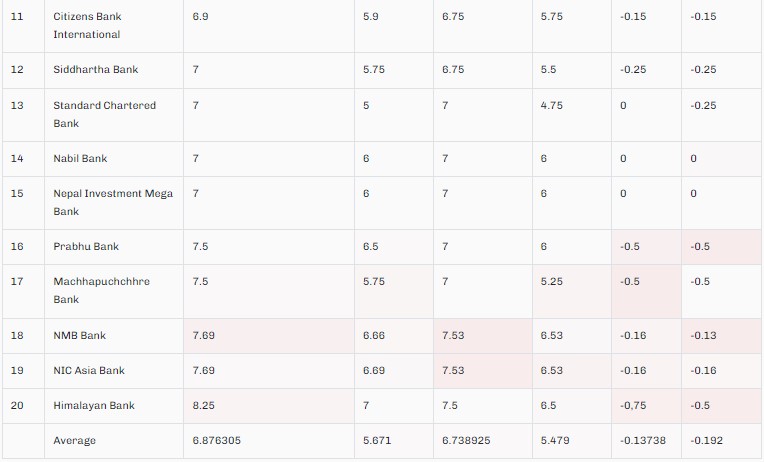 वाणिज्य बैंकहरुको नयाँ ब्याजदर सार्वजनिकः १३ बैंकले घटायो, ५ स्थिर, दुईको वृद्धि (सूची सहित)