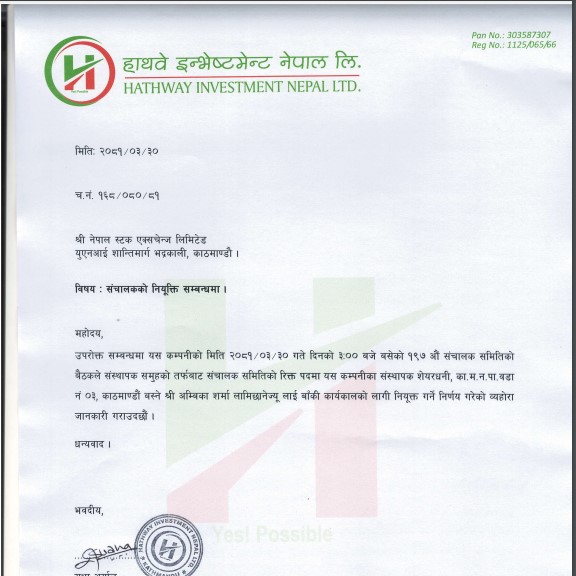 कम्पनी सञ्चालक समितिको असार ३० गते दिनको ३ बजे बसेको बैठकले उनलाई रिक्त रहेको सञ्चालक पदमा नियुक्त गरेको हो ।