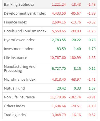 सोमबार ९ उपसूचक राताम्य भएका छन् । आज बैंकिङ समूहको १.४८ प्रतिशत, विकास बैंक समूहको १.८९ प्रतिशत, फाइनान्स समूहको ०.५२ प्रतिशत, होटल तथा पर्यटन समूहको १.७६ प्रतिशत र जीवन बीमा समूहको १.६५ प्रतिशतले शेयर मूल्य ओरालो लागेको हो ।