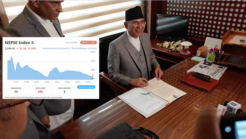 अर्थमन्त्री पौडेल आउने हल्ला चलेका बेला बढेको बजार आज नियुक्ति भएको दिन भने ओरालो लागेको छ । लगानीकर्ता अब आश्वासन भन्दा काम खोजि रहेका छन् । अर्थमन्त्री पौडेलले आज पदभार ग्रहण गर्दै शेयर बजारलाई देशको अर्थतन्त्रको ऐनको रुपमा हेर्ने बताएका छन् । उनले भने, ‘शेयर बजारलाई जुवाघरको रुपमा हेर्दा केहि समस्या देखिएको हो । अब भने पुँजी बजारलाई देशको अर्थतन्त्रको मेरुदण्ड रुपमा हेरिन्छ । सन्तुलित रुपमा विकास हुनेछ ।’