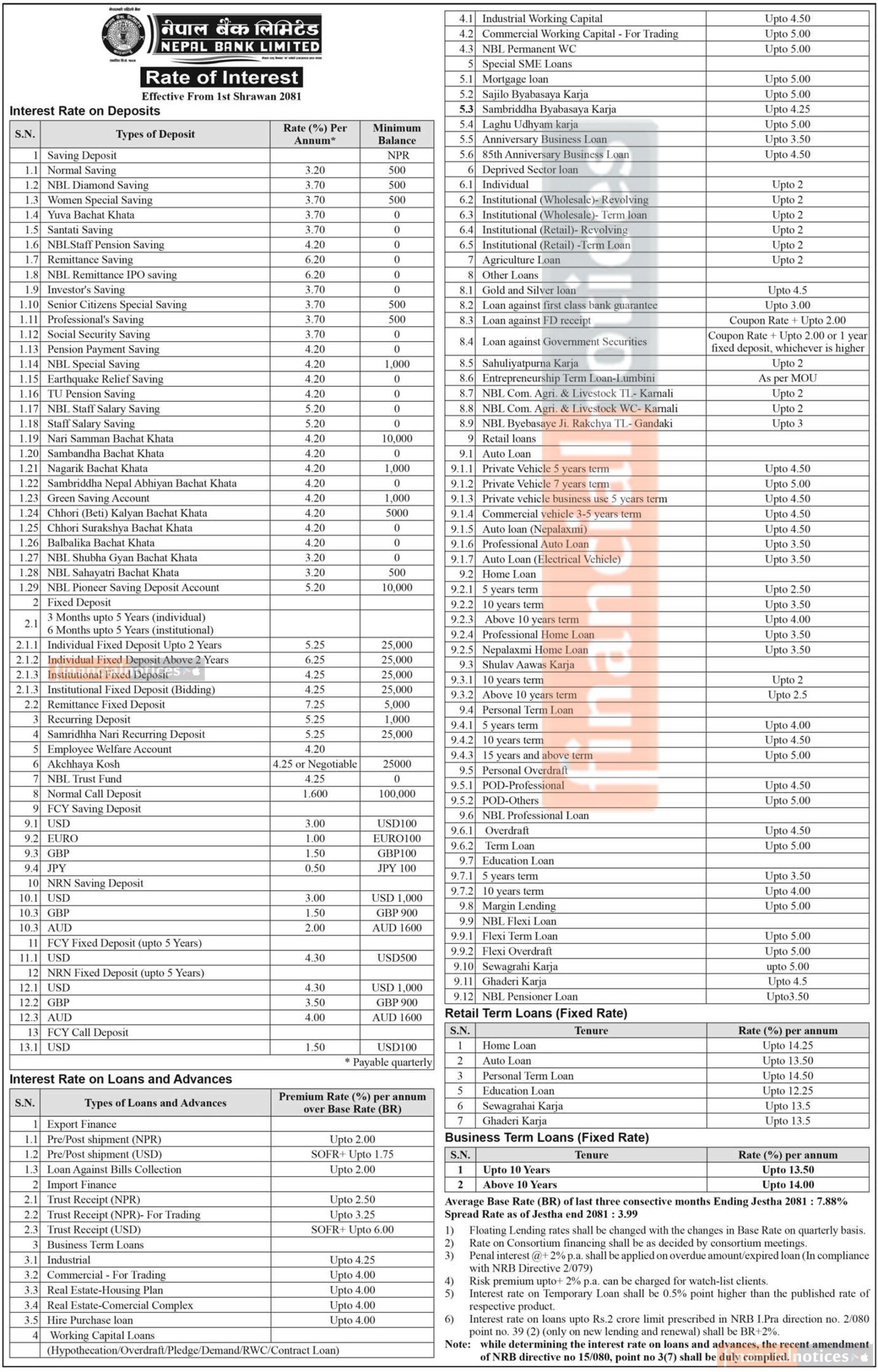 बैंकले घरकर्जामा १४।२५ प्रतिशत, अटो लेनमा १३।५० प्रतिशत, व्यक्तिगत निश्चित अवधिको लोनलाई १४।५० प्रतिशत, शिक्षा कर्जामा १२।२५ प्रतिशत, सेवाग्राही कर्जा १३।५ प्रतिशत र घडेरी कर्जामा १३।५ प्रतिशतसम्म रहेको छ।