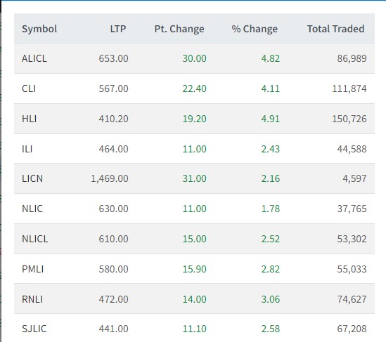 जीवन बीमा कम्पनीहरुमध्ये आज हिमालयन लाइफ इन्स्योरेन्स कम्पनीको शेयरमूल्य सर्वाधिक बढेको छ । कम्पनीको शेयरमूल्य ४.९१ प्रतिशतले बढेर ४१० रुपैयाँमा कारोबार भएको छ । साथै, एशियन लाइफ इन्स्योरेन्सको ४.८२ प्रतिशतले बढेर ६५३ रुपैयाँमा कारोबार भएको छ ।