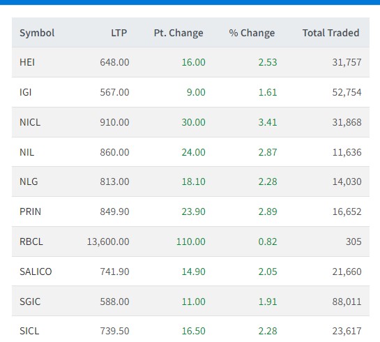 साथै, युनाइटेड अजोड इन्स्योरेन्सको ३.११ प्रतिशतले शेयरमूल्य बढेर ६१७ रुपैयाँमा कारोबार भएको छ । आज प्रभु इन्स्योरेन्सको २.८९ प्रतिशतले बढेर ८४९ रुपैयाँ, नेको इन्स्योरेन्सको २.८७ प्रतिशतले बृद्धि भई ८६० रुपैयाँ, हिमालयन एभरेष्ट इन्स्योरेन्सको शेयरमूल्य २.५३ प्रतिशतले बृद्धि भई ६४८ रुपैयाँमा कारोबार भएको छ ।