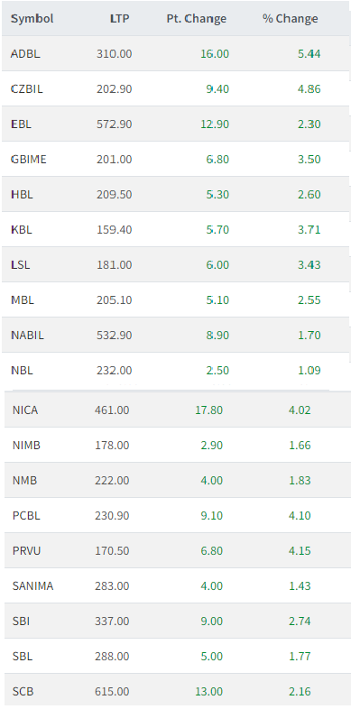 साथै, सिटिजन्स बैंकको प्रतिकित्ता २०२.९० रुपैयाँ, एभरेष्ट बैंकको ५७२.९० रुपैयाँ, ग्लोबल आइएमई बैंकको २०१ रुपैयाँ, हिमालयन बैंकको २०९.५० रुपैयाँ, कुमारी बैंकको १५९ रुपैयाँ, लक्ष्मी सनराइज बैंकको १८१ रुपैयाँ, माछापुच्छे« बैंकको २०५ रुपैयाँ, नबिल बैंकको५३२ रुपैयाँ, नेपाल बैंकको २३२ रुपैयाँ पुगेको छ ।