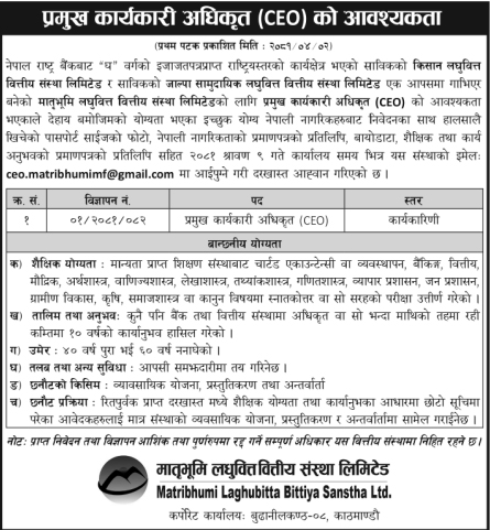 मातृभूमि लघुवित्तमा सिईओ माग, कति चाहिन्छ योग्यता?