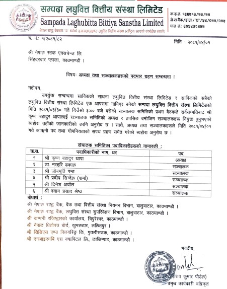 असार ३० गते बसेको सञ्चालक समितिको निर्णयले अध्यक्ष थापा नेतृत्वमा डा.नरहरी ढकाल, जीबमूर्ति पन्त, प्रदीप सिग्देल (शर्मा), दिनेश अर्याल र श्याम प्रसाद श्रेष्ठलाई सञ्चालकमा चयन गरेको छ ।