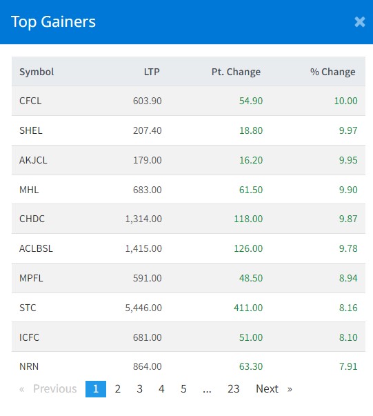 आज पनि २०४ वटा कम्पनीको शेयरमूल्यमा हरियाली छाएको छ । जसमा बुधबार सेन्ट्रल फाइनान्स र सिगंटी हाइड्रोपावरको शेयरमूल्यमा सकारात्मक सर्किट लागेको छ ।