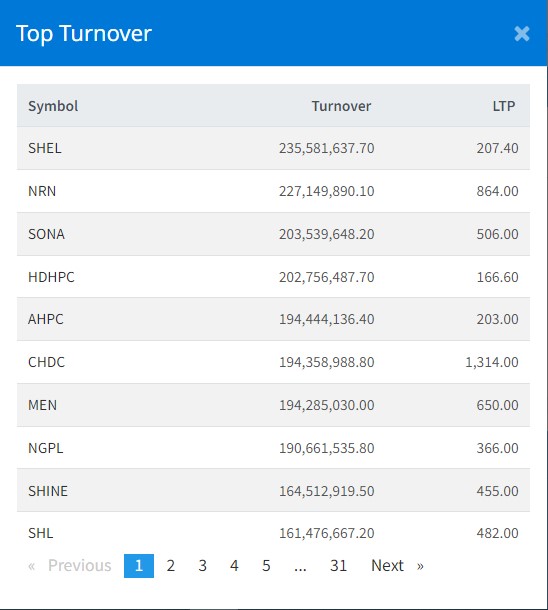 बुधबार १२ अर्ब पाँच करोड रुपैयाँको कारोबार भएको छ । योसँगै बुधबार सिगंटी हाइड्रो इनर्जी लिमिटेडको सर्वाधिक कारोबार भएको छ । कम्पनीको आज २३ करोड ५५ लाख रुपैयाँको कारोबार भएको छ ।