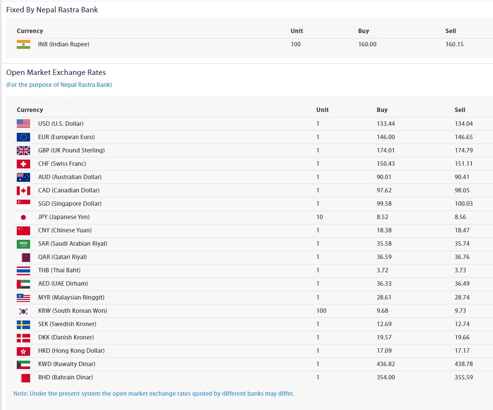 नेपाल राष्ट्र बैंकका अनुसार आज अमेरिकी डलर, कतारी रियाल, साउदी अरेबियन रियाल, यूएई दिराम लगायतका मुद्राको विनिमयदर भने हिजोकै मूल्यमा स्थिर रहेको छ । आज पनि एक अमेरिकी डलरको खरीददर १३३ रुपैयाँ ४४ पैसा र बिक्रीदर १३४ रुपैयाँ ४ पैसा रहेको छ ।