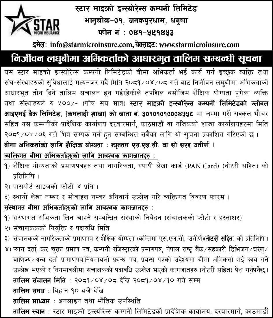 स्टार माइक्रो इन्स्योरेन्सले साउन ८ गतेदेखि अभिकर्ता तालिम सञ्चालन गर्ने