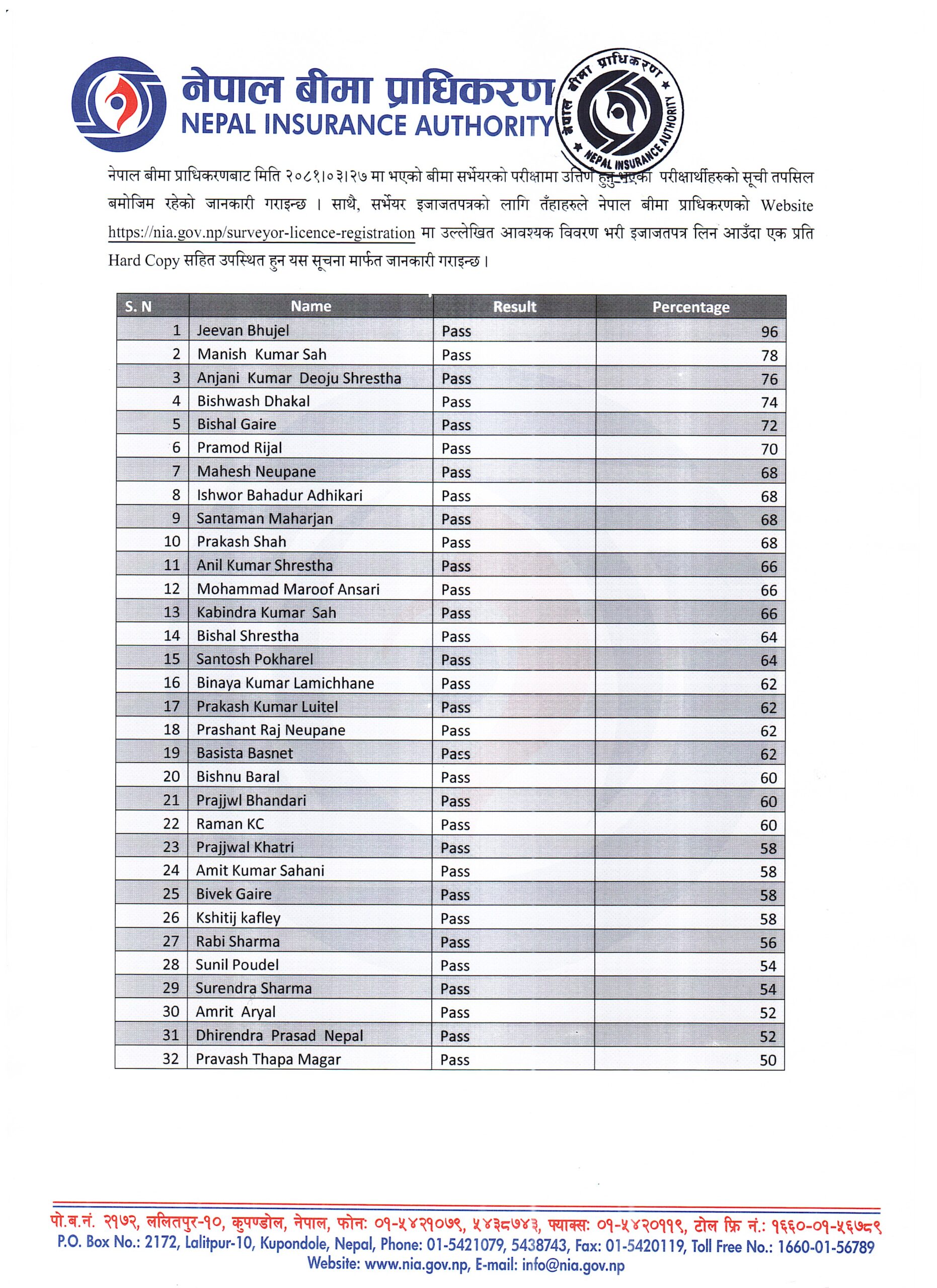 उत्तीर्ण भएका परीक्षार्थीहरूले सर्भेयर इजाजत पत्रका लागि प्राधिकरणको वेभसाइटमा आवश्यक विवरण भरी एक प्रति हार्ड कपि सहित उपस्थित हुन आग्रह गरेको छ ।